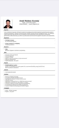 مهندس ميكانيكا خبرة جيدة بمجال الأمن والسلامة ومعرفة في برامج التصميم، أسعى للتطور المهني في مجالات، production, Firefitting, HVAC, plumbing. على استعداد للانضمام الى فريق العمل بشغف وطموح