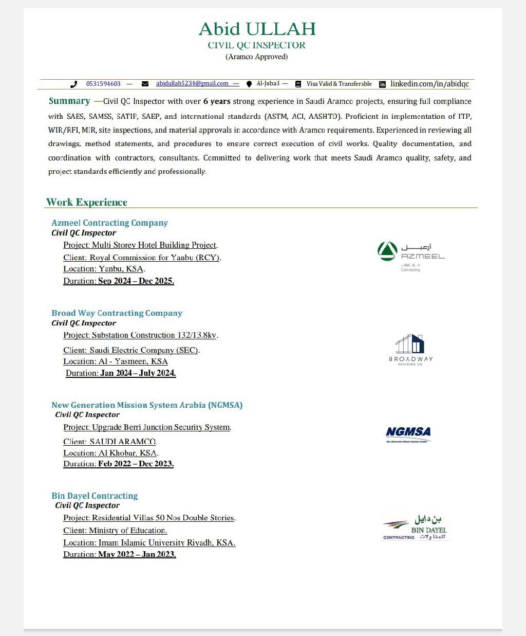 I have done BSC civil Engineering Over 6 Years Experience. Looking for the Position of QC Civil inspector also Aramco approved. Strong knowledge of Aramco Standard like SAES SAEP Samss And international codes like ASTM and ACI ASTM. Strong knowledge to prepare RFI, MIR & Review Method of statement, PQP, and others documents. Maintains daily logs including WIR log, Compressive Strength log, FDT log