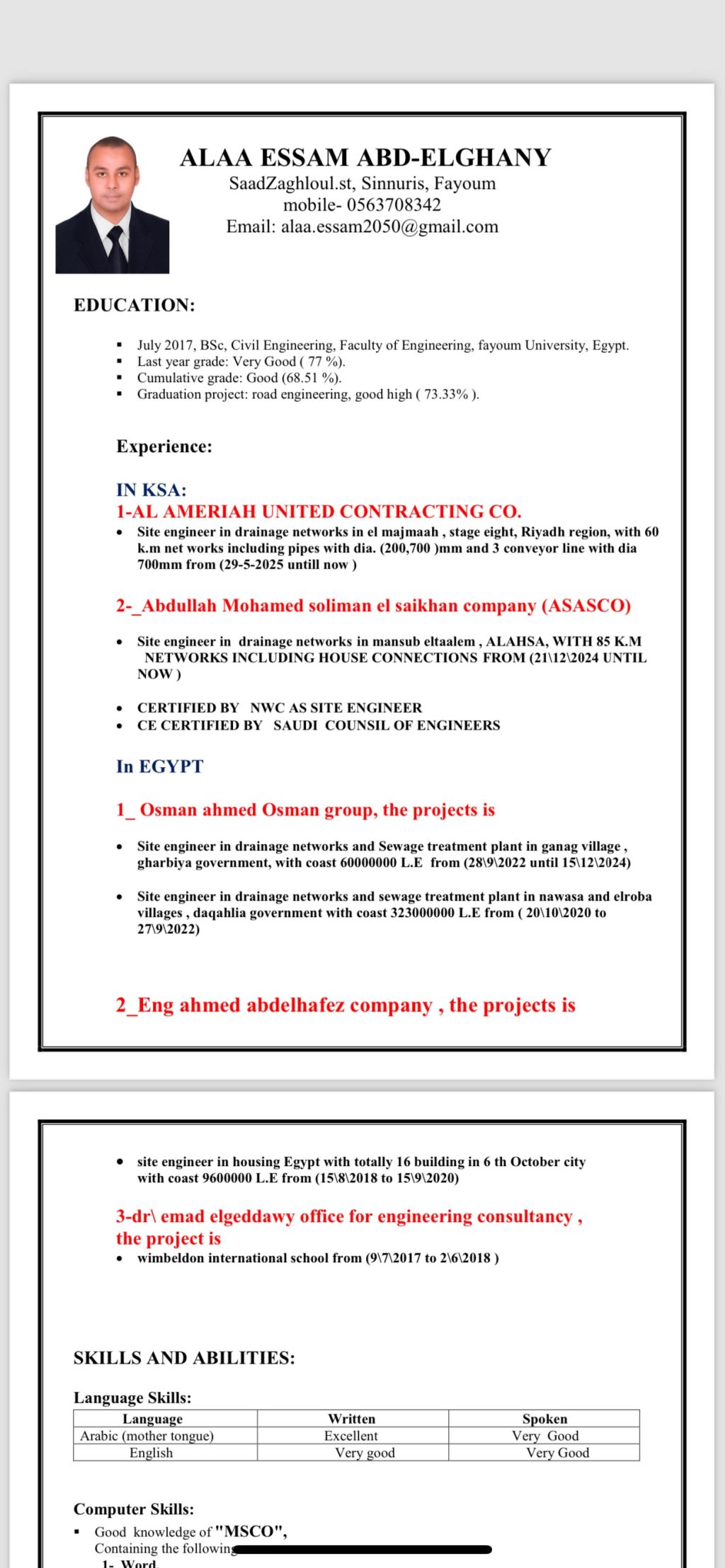 مهندس مدني موقع بنية تحتية خبرة + 8 سنوات معتمد من شركة المياه الوطنية في المنطقة الشرقية ومنطقة الرياض معتمد من الهيئة السعودية للمهندسين إقامة سارية حتى شهر 3