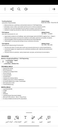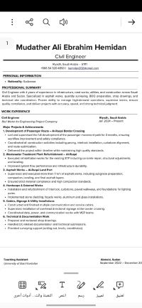 Sudanese Civil Engineer residing in Saudi Arabia, with 4 years of experience in construction projects and technical office work across Saudi Arabia and Sudan. Specialized in road works, asphalt, interlock, finishing works (glass and cladding) concrete structural works, and preparation of technical documentation, Aconex platform tasks