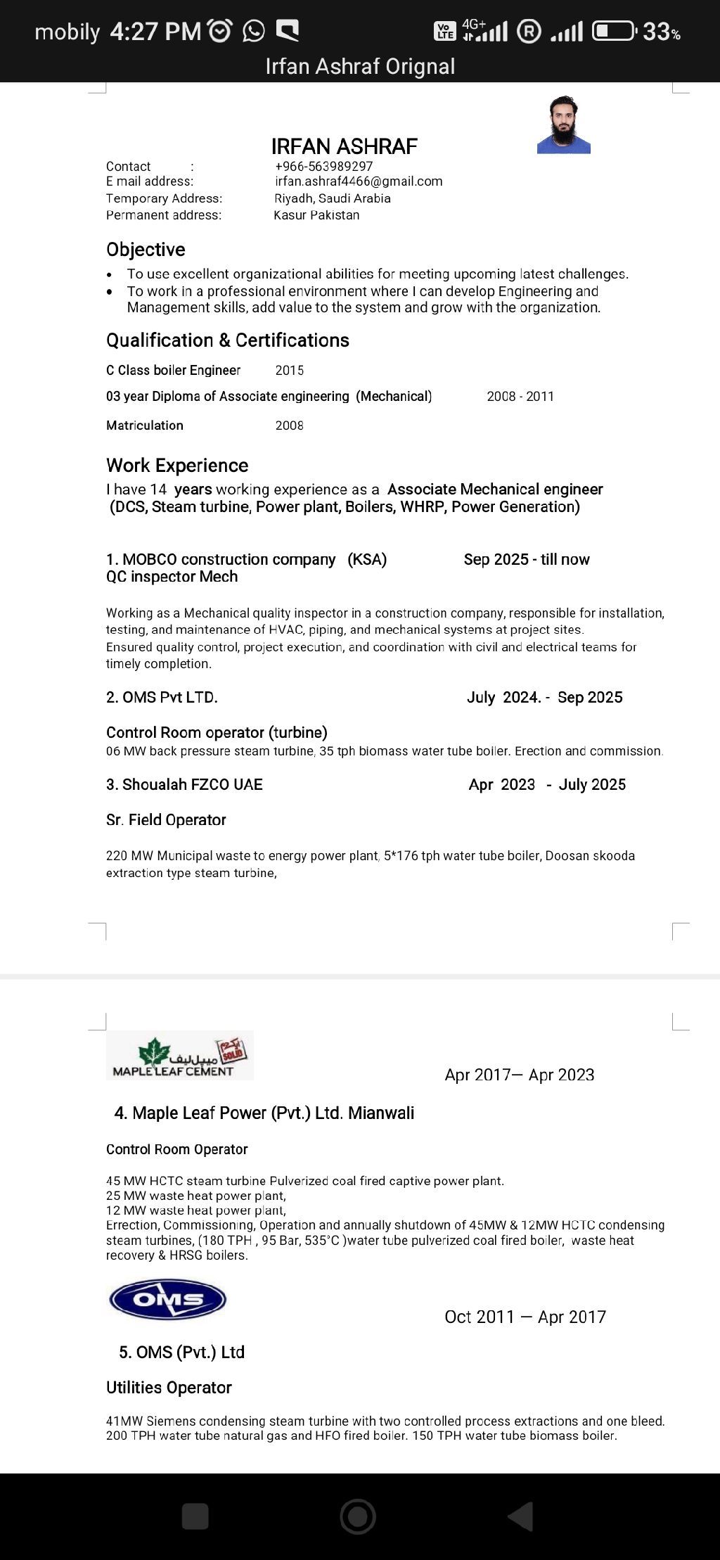 I have 14 years experience as a power plant Operator, Machine Operator, Control room operator, DCS operator in process and power production, Also have experience in maintenance for mechanical and auto vehicles