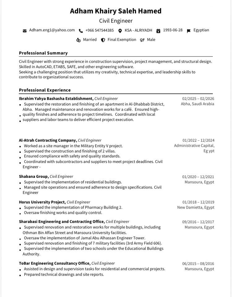 مهندس مدني تنفيذ موقع خبرة 10 سنوات أعمال انشاءات وتشطيبات وصيانة خبرة داخل المملكة