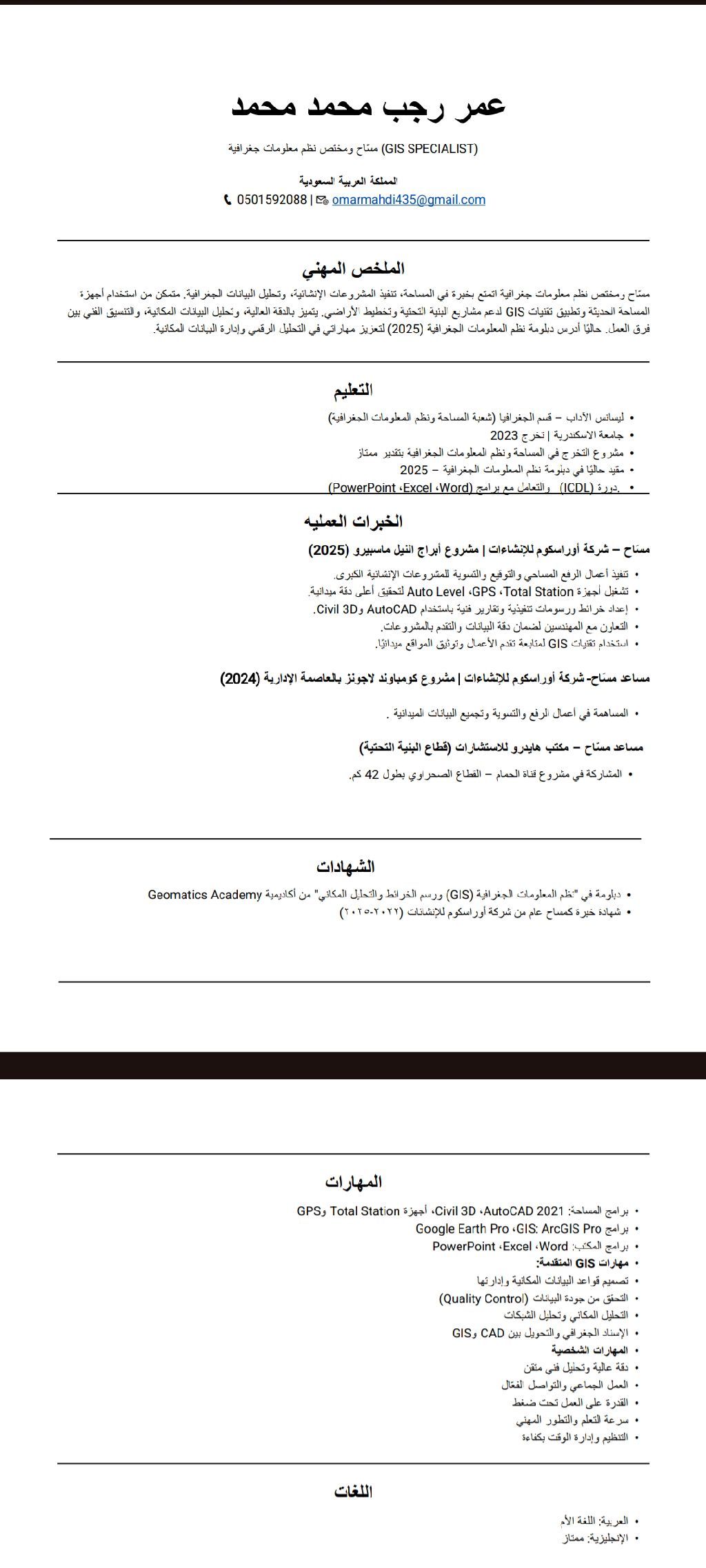 مساح ومختص نظم معلومات جغرافية أتمتع بخبرة في المساحة وتنفيذ المشروعات الانشائية، وتحليل البيانات الجغرافية. متمكن من استخدام اجهزة المساحة الحديثة وتطبيق تقنيات GIS لدعم مشاريع البنية التحتية وتخطيط األراضي يتميز بالدقة العالية، وتحليل البيانات المكانية، والتنسيق الفني بين فرق العمل