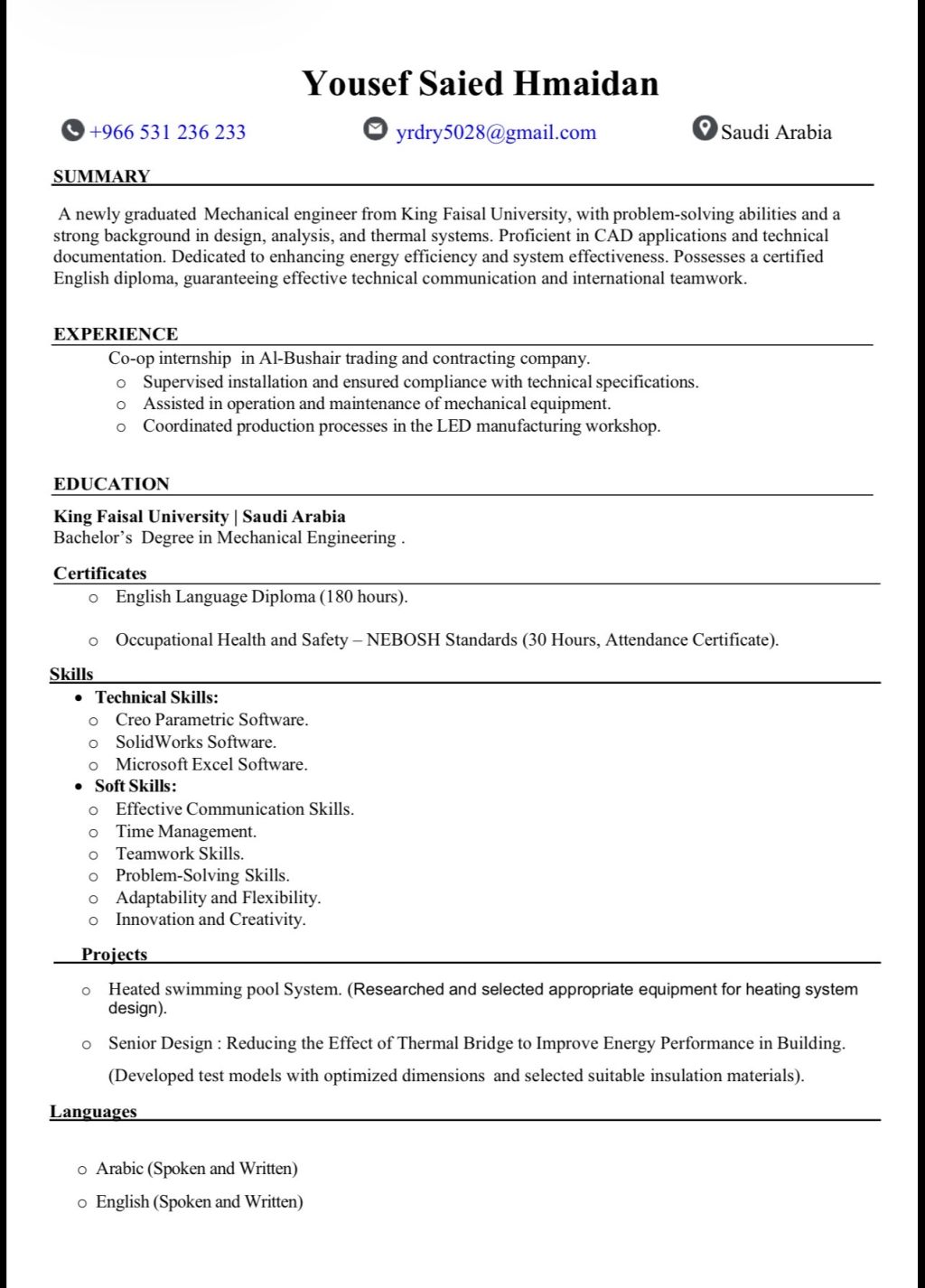 Motivated Fresh Graduate Mechanical Engineer seeking an opportunity to apply academic knowledge and build professional experience in a dynamic and challenging work environment. Interested in mechanical design, HVAC systems, and maintenance, with a strong willingness to learn and grow