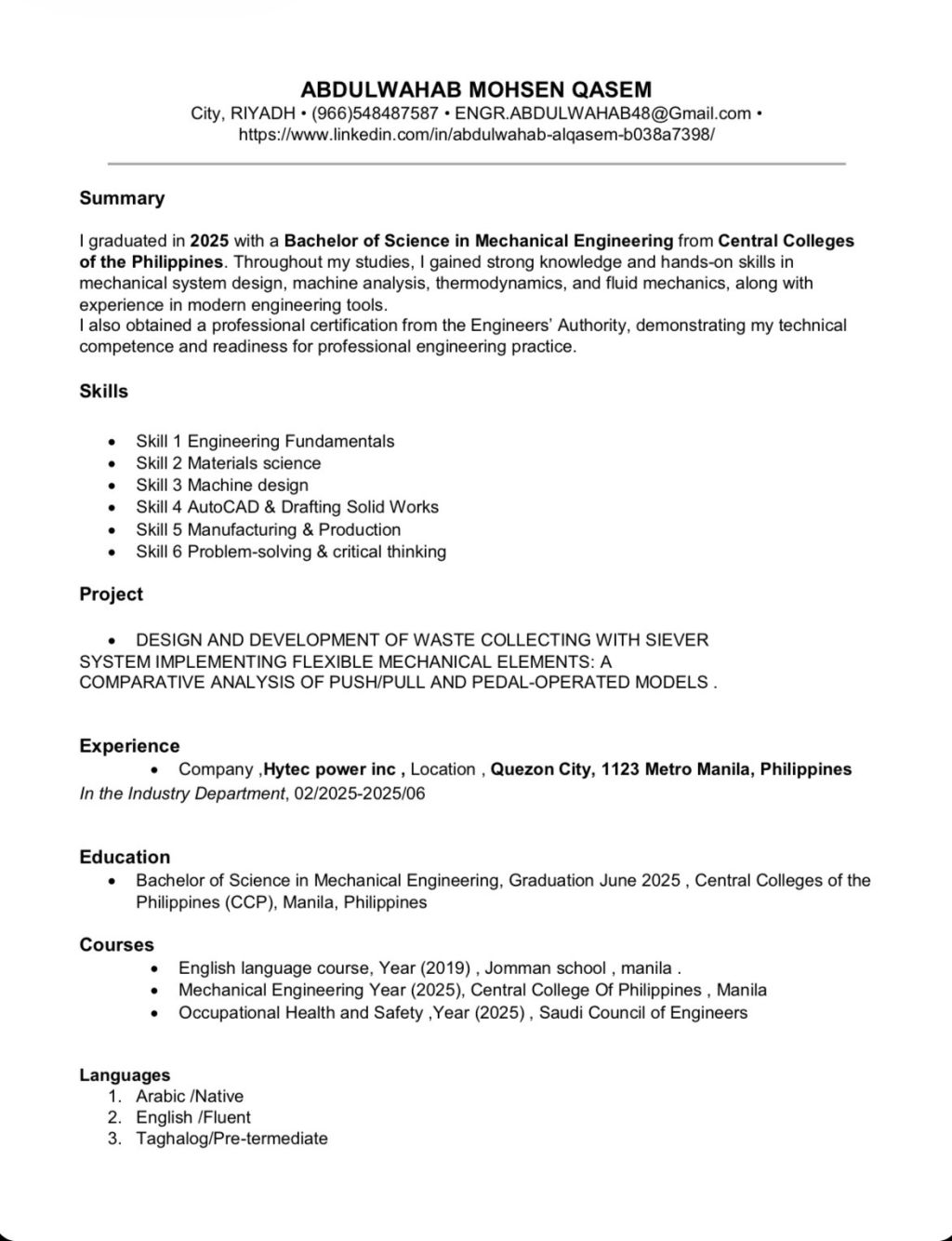 عبدالوهاب محسن، مهندس ميكانيكي ابحث عن وظيفة هندسية في الرياض