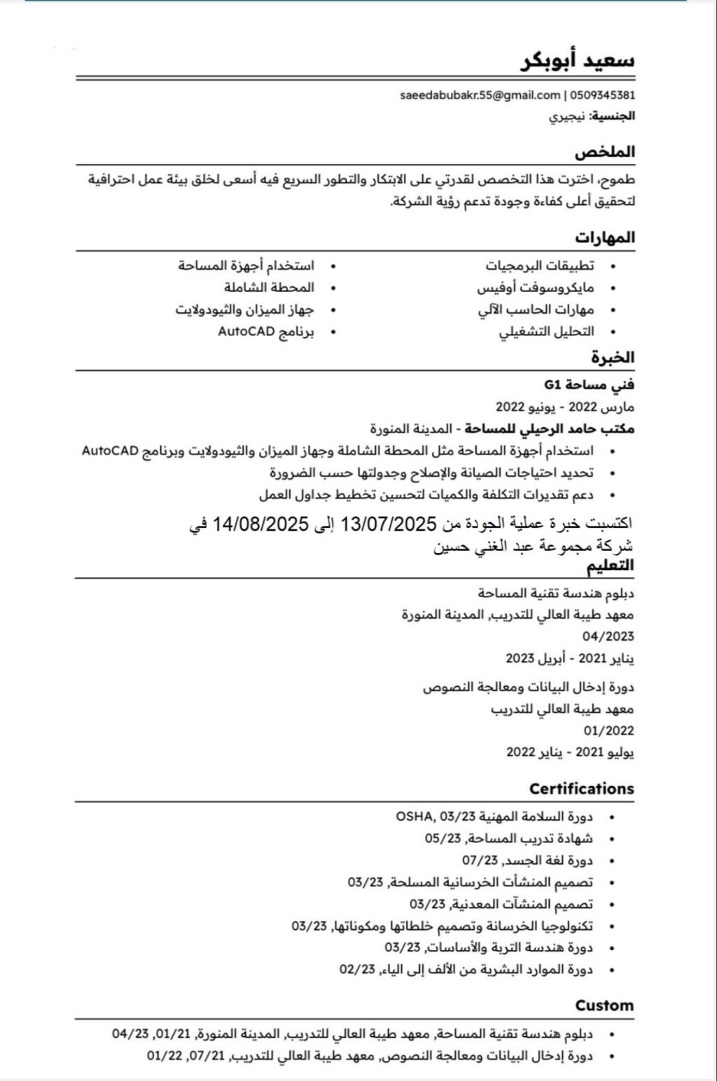 أود التقدم على وظيفة فني مساحة لديكم حيث أملك دبلوم هندسة مساحية ما خذ دورات تدريبية في برنامج الورد والاكسل والاوتوكاد طموحي أن أكون فرد مفيدا في مجتمع من خلال أني ابداً وظيفة تتناسب في تطلعا تي المستقبلية وتنمي من قدراتي