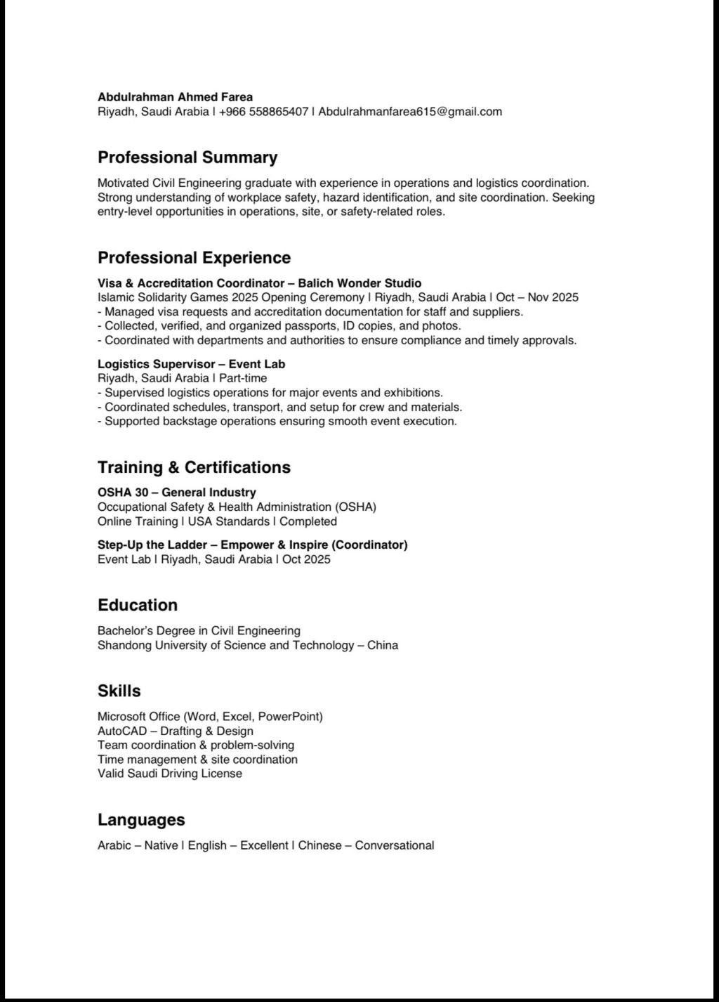 I am a motivated Safety professional with a strong interest in HSE roles and a completed OSHA certification. I have a solid understanding of workplace safety practices, hazard identification, and compliance with safety regulations. I am eager to apply my safety knowledge on - site, contribute to maintaining a safe working environment, and grow my career within the Health & Safety field