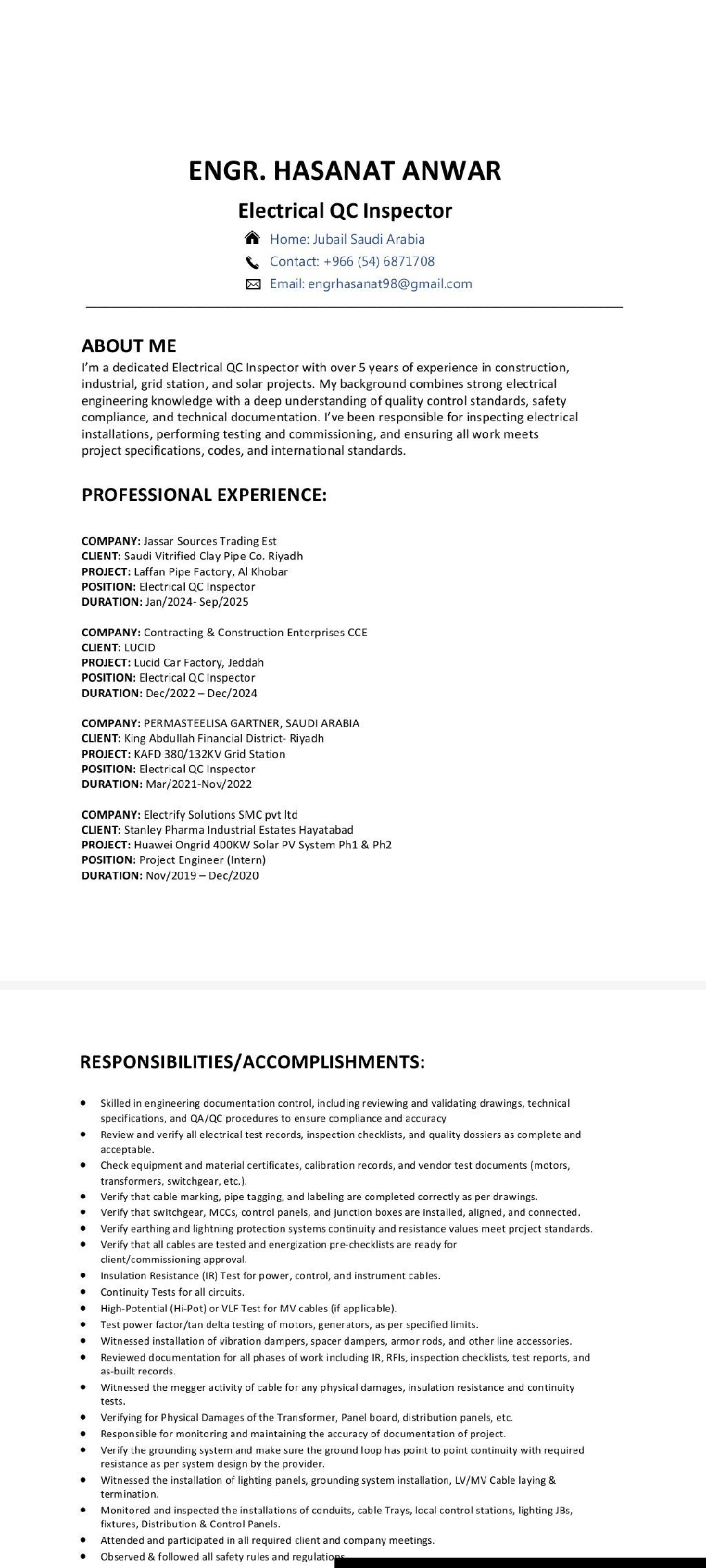 Electrical Engineer with 5 + years of experience in Industrial, grid station, and solar projects in Saudi Arabia, including LUCID and KAFD. Skilled in electrical inspections, testing & commissioning, QA/ QC documentation, LV/ MV systems, grounding, and compliance with international standards. Bachelor’s in Electrical Engineering, NEBOSH IGC certified. Iqama transferable
