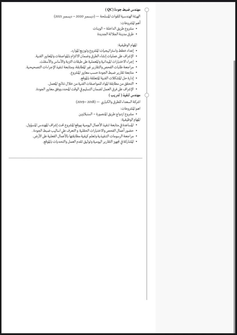 مهندس مدني طرق وبنية تحتية خبرة 5 سنوات في تنفيذ والاشراف على مشروعات الطرق، أعمال الردم والطبقات الاسفلتية، ضبط الجودة والاختبارات، قراءة اللوحات وحصر الكميات، واعداد التقارير. خبرة بمواقع العمل والتعامل مع الاستشاري والمقاولين. متاح للعمل داخل السعودية وجاهز للمباشرة