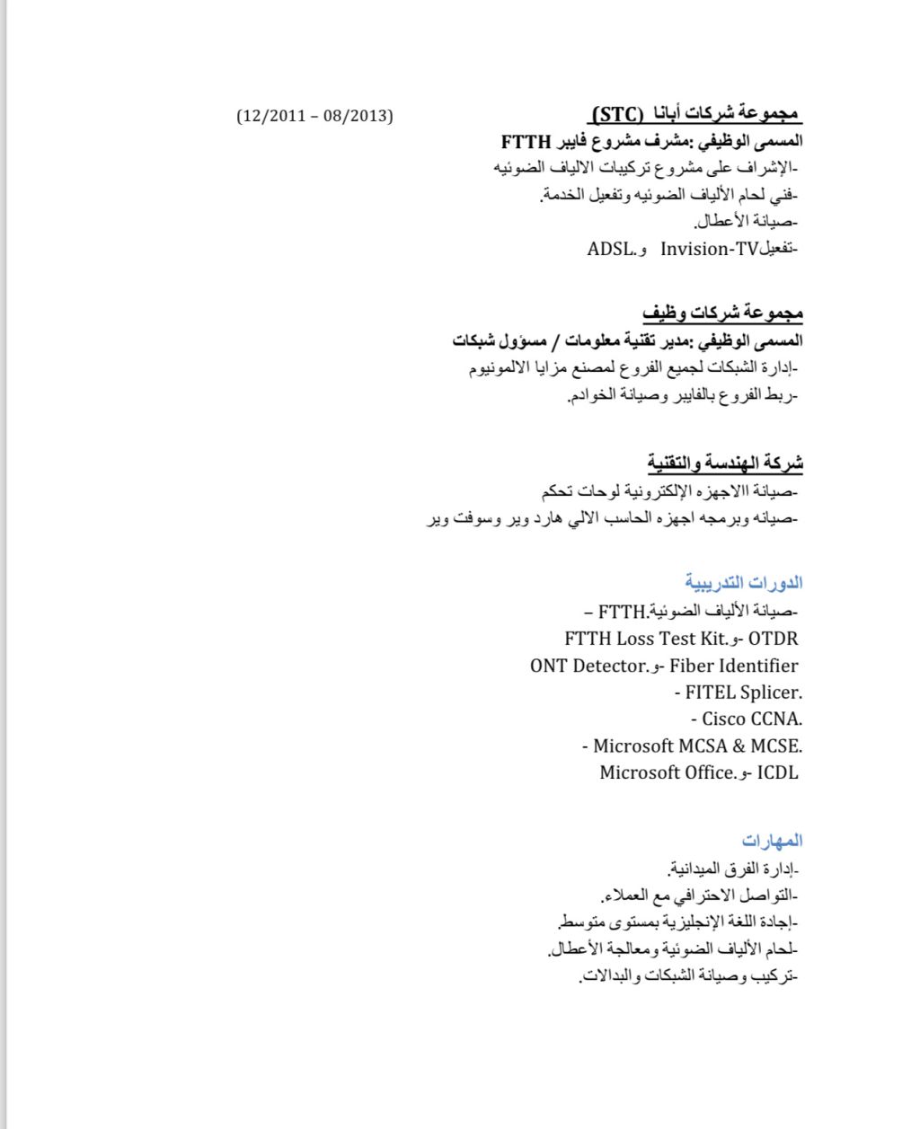 ابحث عن عمل مشرف ميداني لدي خبرة 14 سنة بجميع مشاريع الاتصالات السعودية STC لمشاريع التركيبات وصيانة الألياف الضوئية FTTH خبرة بالعمل الميداني والمكتبي