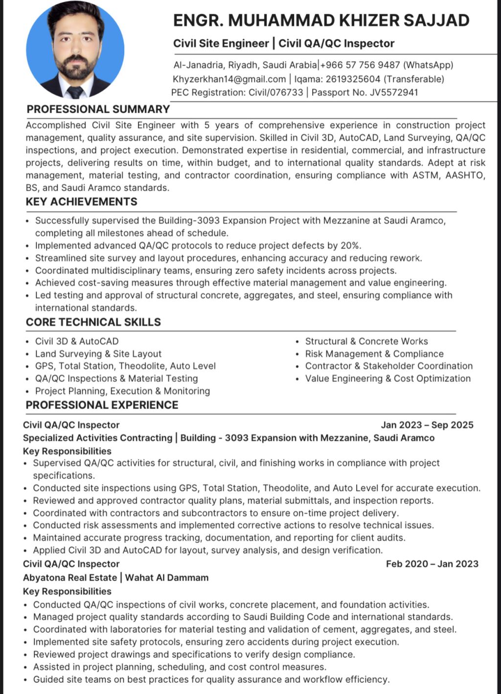 I am professional civil engineer having more than 5 years of experience in construction field. I have served in many projects such as infrastructure development, high rise buildings etc. I have valid Iqama which is transferable and can relocate to anywhere in Saudi Arabia immediately. I have experience in execution work, site management, supervision, safety protocols, designing and survey work