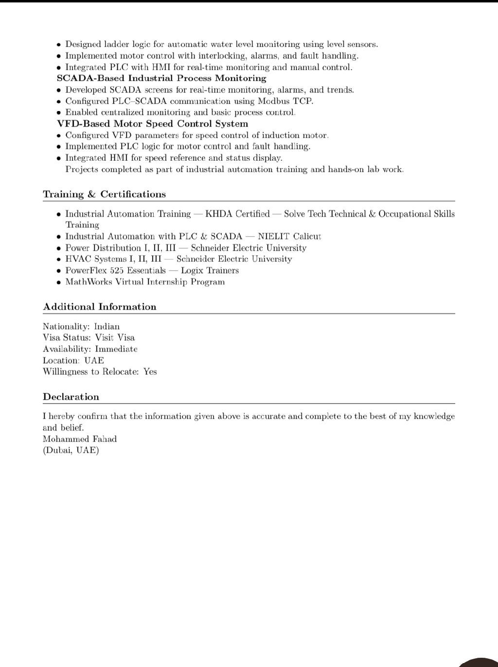 Entry - level Automation Engineer with hands - on Industrial training in PLC programming, SCADA/ HMI systems, VFDs, and field instrumentation. Strong foundation in control logic, real - time systems, and Industrial communication protocols, with prior experience in FPGA system design. Motivated to contribute to automation and Industrial operations while continuously developing technical expertise