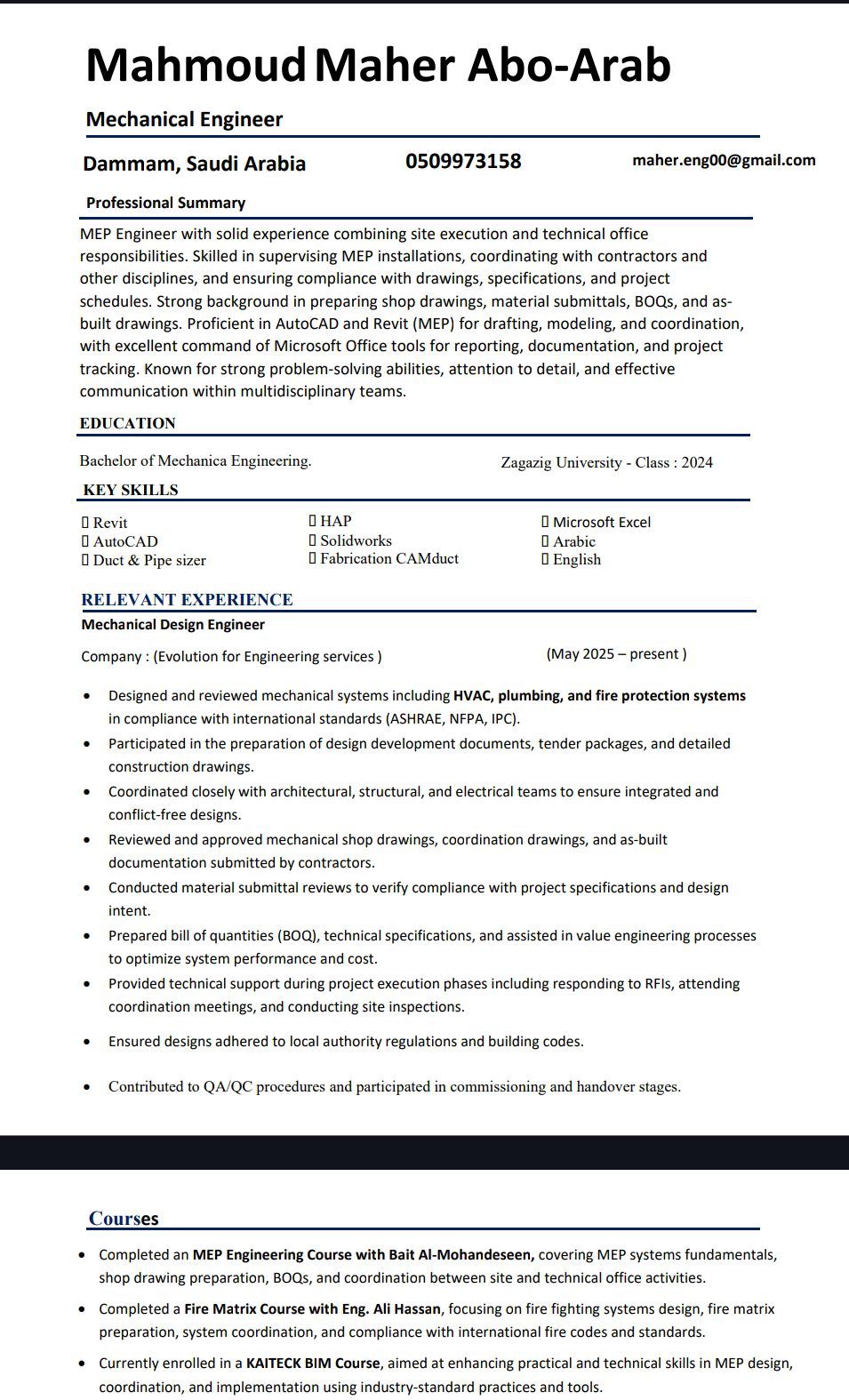 مهندس ميكانيكا MEP خريج 2024 يجيد الجمع بين أعمال الموقع والمكتب الفني. يعمل علي تصميم وتنفيذ أنظمة التكييف HVAC والسباكة PLUMBING ومكافحة الحريق FIRE FIGHTING واعداد الشوب دروينج وحصر الكميات يجيد استخدام AutoCAD وRevit MEP وExcel عملت في مكتب تصميم لاعداد مخططات أل WATER SUPPLY باستخدام برامج الاوتوكاد AutoCAD والريفيت Revit متاح للعمل في أي مكان في المملكة مع وجود إقامة سارية