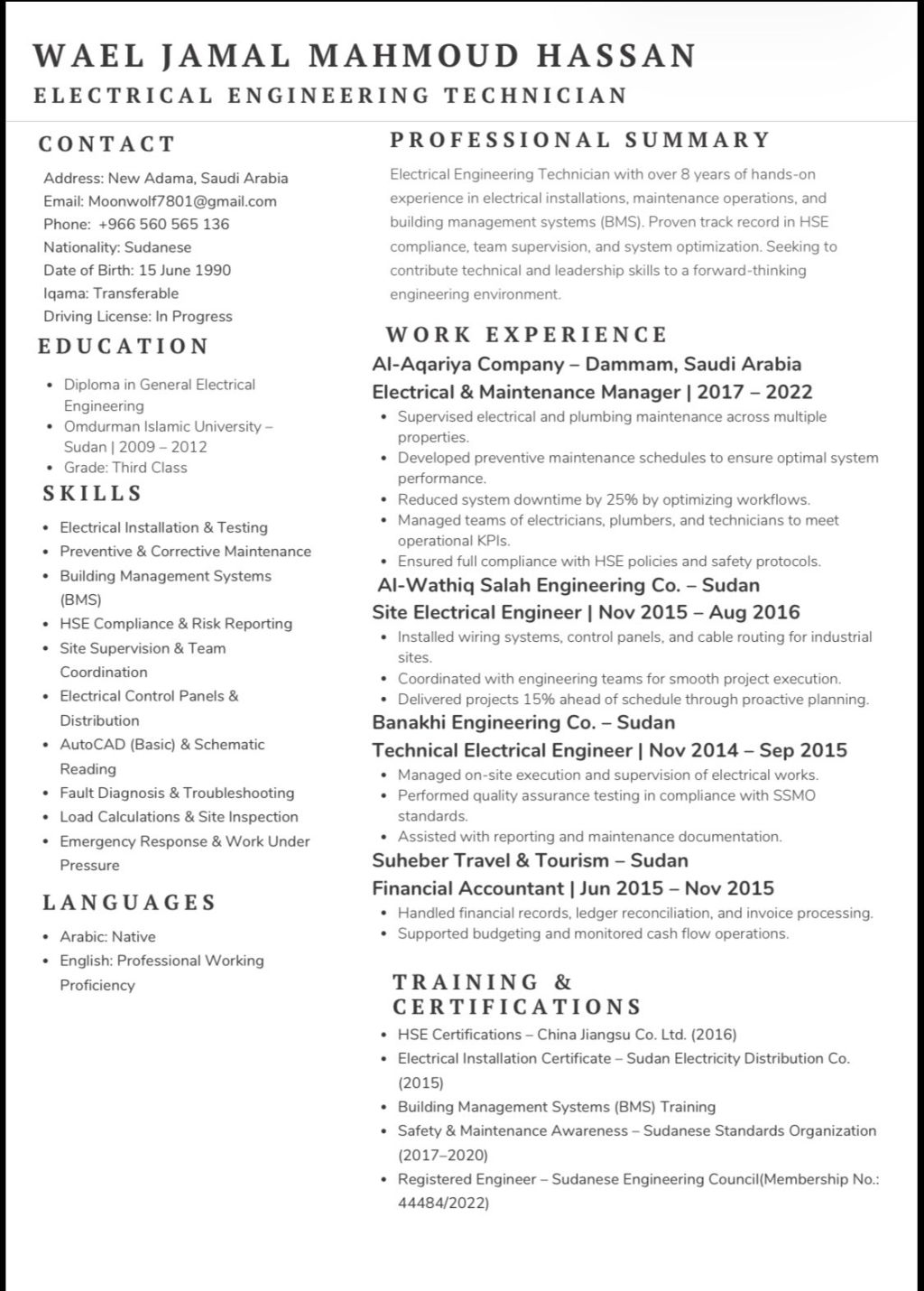 خريج جامعي هندسة كهرباء خبرة في مجال الانشاءات والصيانات الكورسات 1 / PMP (introduction to project management professional with artificial intelligence 2/ BMS building Management system 3/ electric installation 4/ HSE (Work at heights) 5/ HSE (basic hazard awareness. خبرة في مجال الانشاءات والمباني ومتابعه والاشراف وايجاد حلول للمشاكل وانجاز المهام الموكلة الى بما يتناسب مع الوقت للمشروع