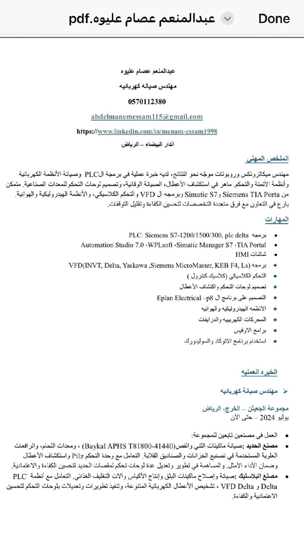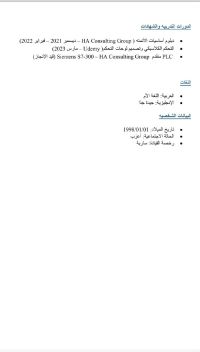 مهندس كهرباء صيانة وتشغيل ابحث عن عمل خبرة أكثر من أربع سنوات في مجال التحكم والصيانة وتصميم لوحات الكنترول للألات الصناعية وخطوط الانتاج ومضخات المياه خبرة في برمجة جميع أنواع الدرايفرات VFD وبرمجة أل plc خبرة داخل المملكة ثلاث سنوات متاح نقل كفالة