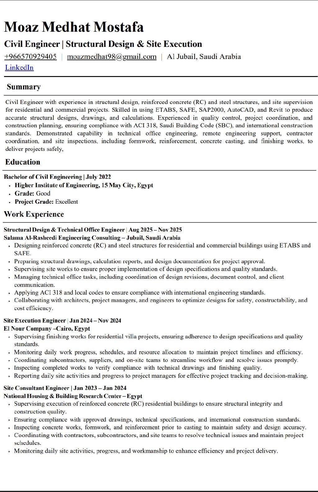 مهندس مدني حاصل على بكالوريوس الهندسة المدنية ومتواجد في الجبيل اعمل تصميم واشراف وتنفيذ وعندي خربة 3 سنين