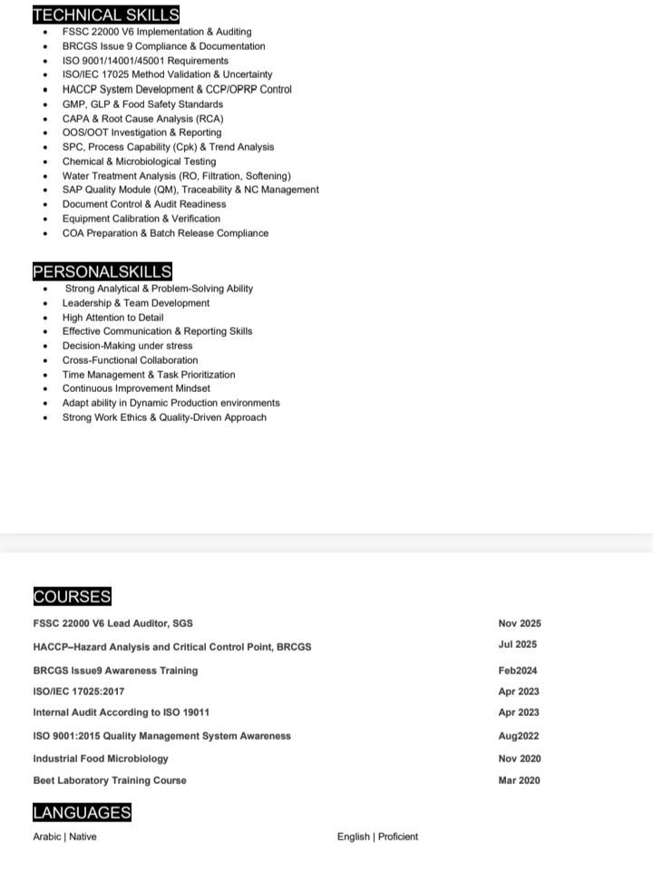مسؤول جودة وسلامة غذاء ومعامل بخبرة 10 سنوات في الصناعات الغذائية. خبرة قوية في إدارة وتشغيل المعامل وتطبيق أنظمة ISO 9001 وFSSC 22000 وBRCGS وISO 17025 واعداد SOPs ومتابعة سلامة الغذاء. اشراف على التحاليل الكيميائية ومحطات المياه RO وDemi مياه الصرف الصحي والصناعي. متواجد داخل السعودية وجاهز للعمل فورا. خبرة في التدريب والتدقيق الداخلي والتعامل مع الجهات الرقابية وتحسين الأداء وتقليل الهدر