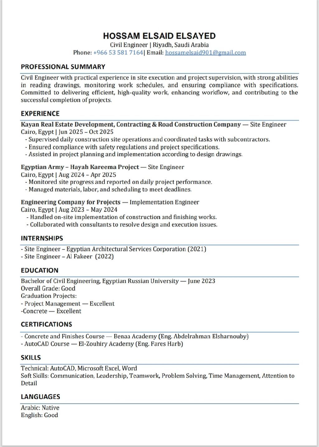 مهندس مدني مصري الجنسية خبرة (سنتين ونصف) خبرة في أعمال التنفيذ (خرسانات - تشطيبات) واستلام الأعمال طبقا للمواصفات الفنية. أجيد العمل علي برامج (AutoCAD - Excel) لدي القدرة علي الاشراف علي الموقع ومتابعة العمال والمقاولين واستلام الأعمال الانشائية والتشطيبات معيا إقامة سنة ومتاح نقل كفالة ابحث عن فرصة مناسبة داخل السعودية جاهز للعمل فورا والالتزام الكامل بالمواعيد