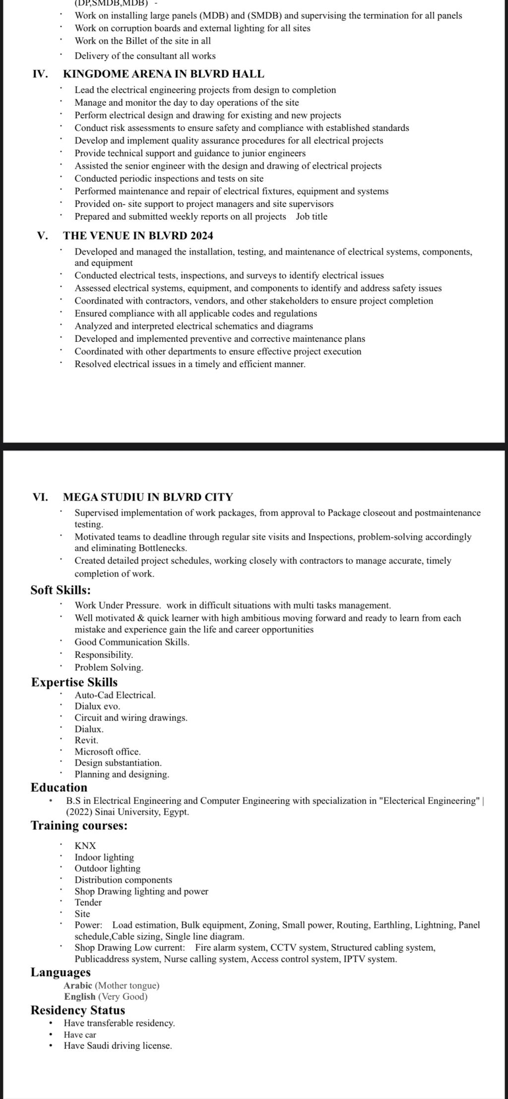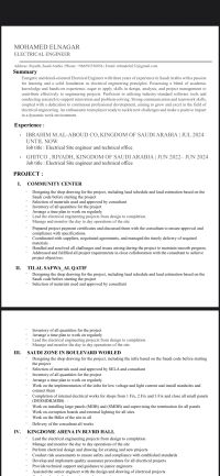 مهندس كهرباء بخبرة تمتد الى أربع سنوات داخل المملكة العربية السعودية. عملت في عدد من المشاريع ضمن المكتب الفني والموقع، اعداد المخططات التنفيذية (Shop Drawings) وأعمال التوريد، واعداد المستخلصات، متابعة الاعتمادات الخاصة بكل منها. شاركت في تنفيذ مشاريع ترفيهية بمنطقة البولفار، بعدد خمسة مشاريع، من ضمنها مشروع Saudi Zone وفي الاسكان شاركت ب 520 فيلا ومول، حصلت علي 10 كورسات في كل أنظمة الكهرباء