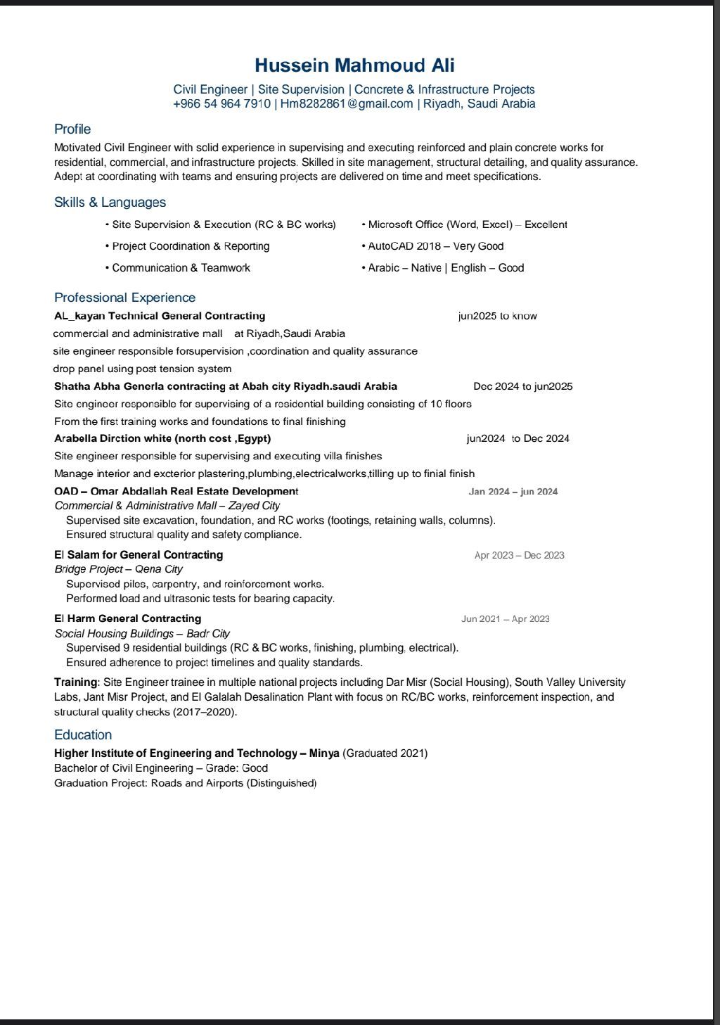 مهندس مدني، خبرة 4 سنوات ونصف منهم سنة ونصف في المملكة خبرة في الخرسانات والتشطيبات ولاند سكيب مولات وفلل وعمارات وشاليهات إقامة سارية لمدة عام متواجد في الرياض جاهز لنقل كفالة جاهز للعمل في أي مكان في المملكة