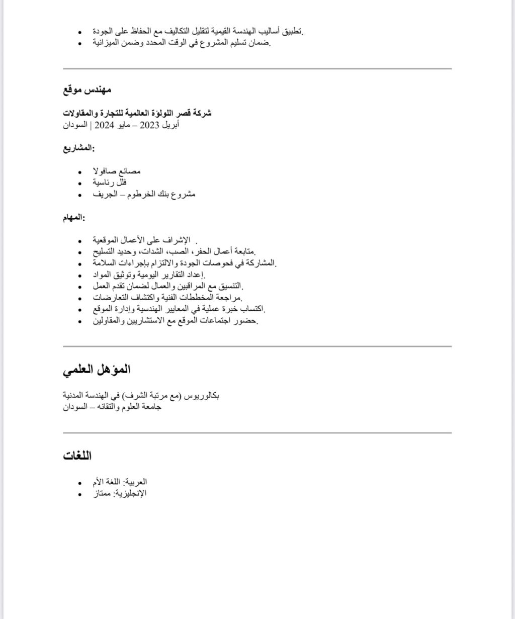 مهندس مدني خبرة ثلاث سنوات عملت كمهندس مدير مشروع لدى شركة تطوير عقاري في الرياض خبرة في أعمال التنفيذ والاشراف بالمواقع. متابعه الأعمال بالموقع، قراءة المخططات، حصر الكميات، أعمال steel construction, واعداد التقارير اليوميه والشهريه مع اجادة أعمال المكتب الفني ومراجعة التصاميم متوفر رخصة قيادة وإقامة سارية