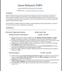Planning & Project Control Engineer with PMP certification and Saudi Council of Engineers membership. Experienced in preparing WBS, baseline schedules, and detailed project programs using Primavera P6. Skilled in updating schedules, tracking progress, and monitoring project performance. Proficient in Power BI and Excel for reporting and dashboard preparation