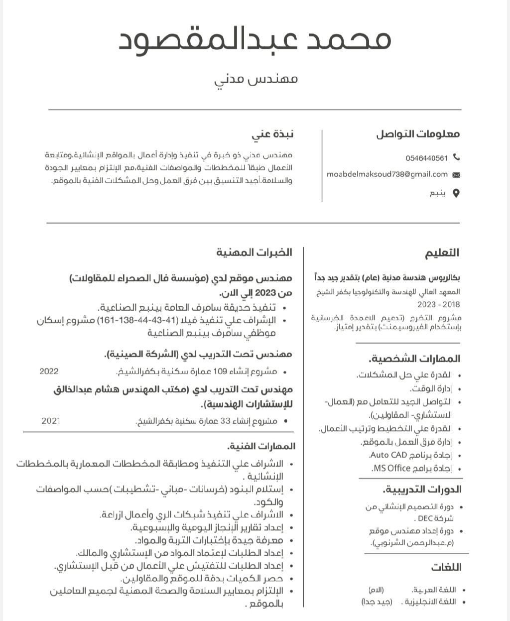مهندس مدني خبرة عامين في المملكة العربية السعودية. خبرة في أعمال الإنشاءات التشطيبات واللاند سكيب. أجيد برنامج الاوتوكاد وبرامج مايكروسوفت أوفيس. أجيد حصر الكميات. لدي رخصة قيادة سارية