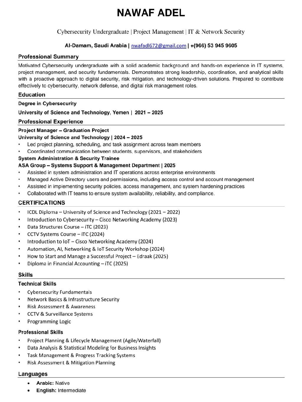 مهندس أمن سيبراني لدي خبرة عملية من خلال العمل على مشاريع تقنية في الدعم الفني، إدارة الأنظمة، تحليل التهديدات السيبرانية، أساسيات الشبكات، المحاسبة المالية، وتركيب وبرمجة أنظمة المراقبة (CCTV) ابحث عن فرصة عمل مناسبة لتطوير خبرتي والمساهمة بفاعلية في بيئة عمل احترافية