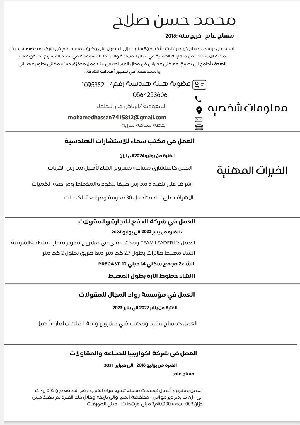 مساح عام خبرة 8 سنوات جميع الاجهزة والبرامج الهندسية وجميع قطعات العمل المختلفة رخصة قيادة مشترك بالهيئة الهندسية