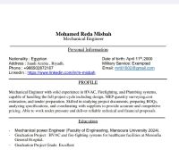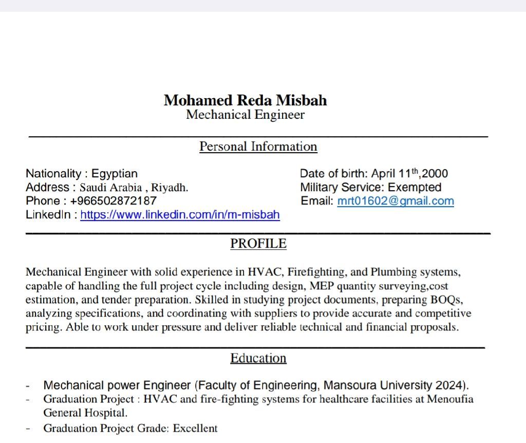 مهندس ميكانيكا في مجال الهندسة الميكانيكية (HVAC - Fire Fighting - Plumbing)
