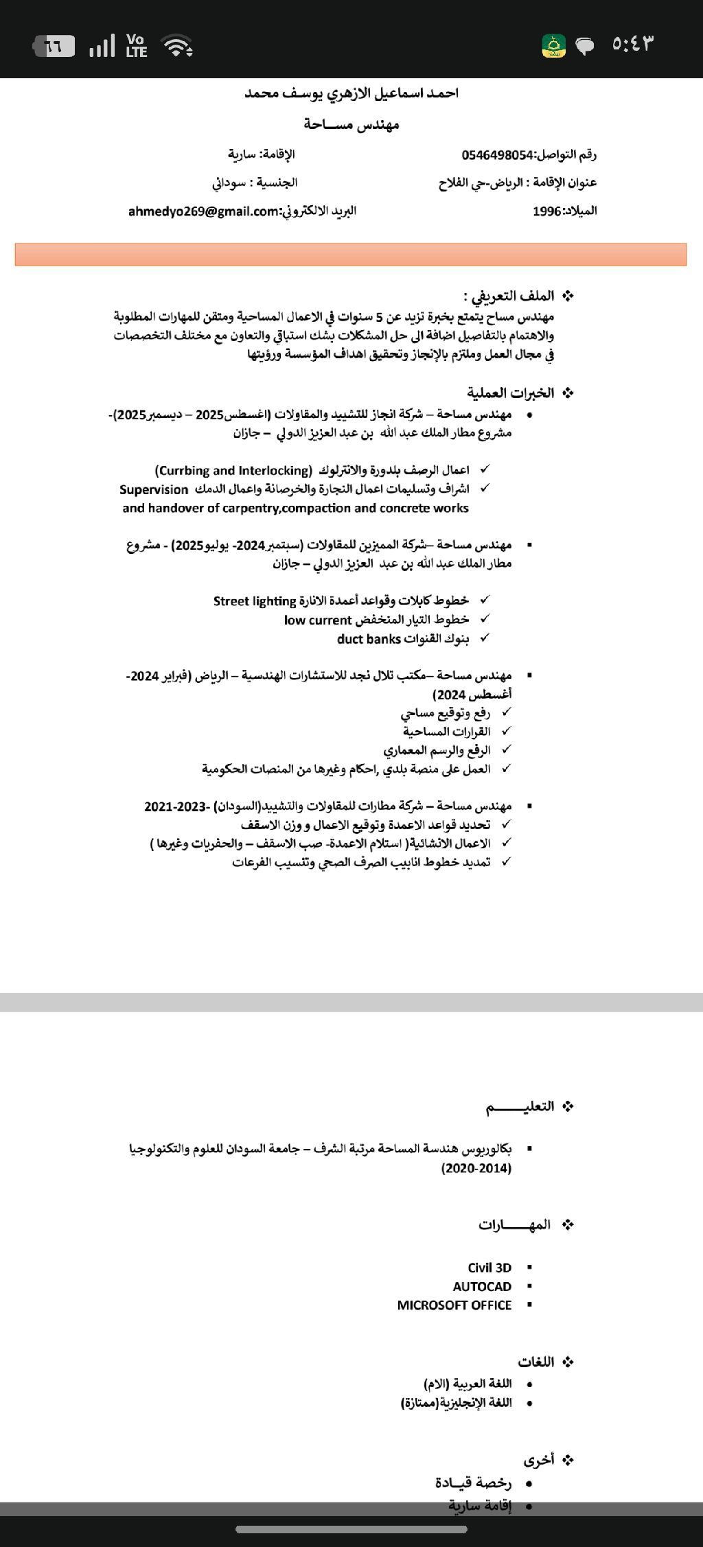 Sudanese surveyor with a bachelor's degree in surveying with honors from Sudan University of Science and Technology. Five years of experience in surveying and all surveying equipment, including two years in Saudi Arabia. Dedicated, passionate, and hardworking. I would like to work in a competitive environment and increase my experience and knowledge. Committed to achieving the organizations'goals