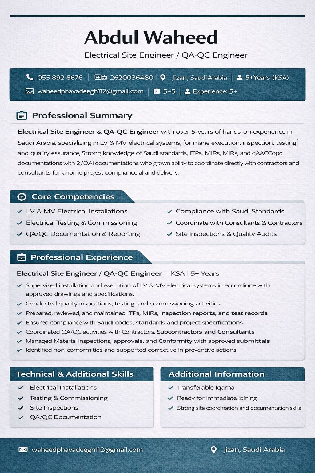 Experienced Electrical Site Engineer and QA/ QC Engineer with over five years of hands - on experience across Saudi Arabia and Pakistan. Proven expertise in electrical installations, inspections, testing, quality control procedures, and site coordination. Strong knowledge of Saudi codes, project specifications, and safety standards. Skilled in documentation, inspections, snag resolution, and ensuring