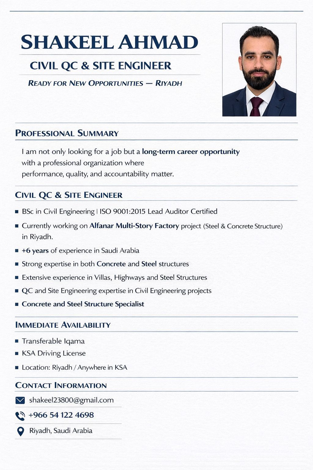 Civil QC & Site Engineer with 5 + years of experience in Saudi Arabia, specializing in concrete and steel structures. Currently working on Alfanar Multi - Story Factory (steel structure) in Riyadh. ISO 9001:2015 Lead Auditor certified. Seeking not just a job, but a long - term career opportunity. Transferable Iqama, KSA driving license, immediate availability