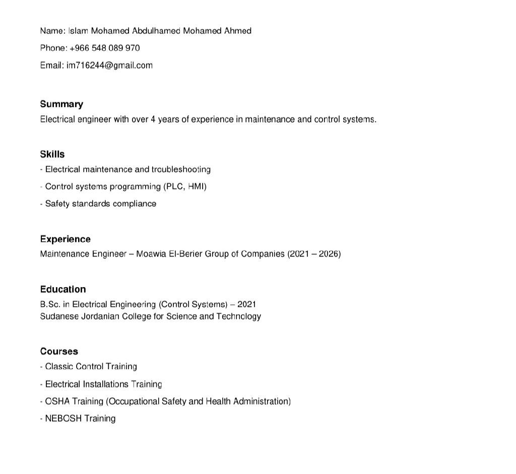 مهندس كهرباء (صيانة) سوداني الجنسية خبرة 4 سنين في المجال الصناعي ابحث عن عمل