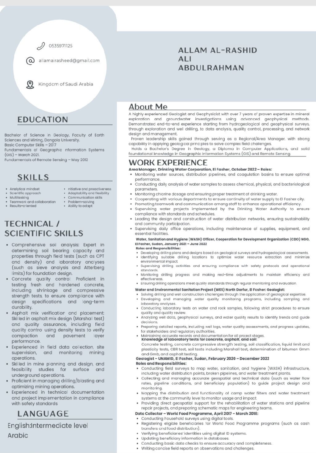 مهندس جيولوجي مختص في حفر أبار المياه الجوفية وعمل تحاليل وجودة المياه ومختصر في عمل اختبارات التربة والخرسانة والاسفلت. متاح للعمل. إقامة سارية ورخصة قيادة سارية
