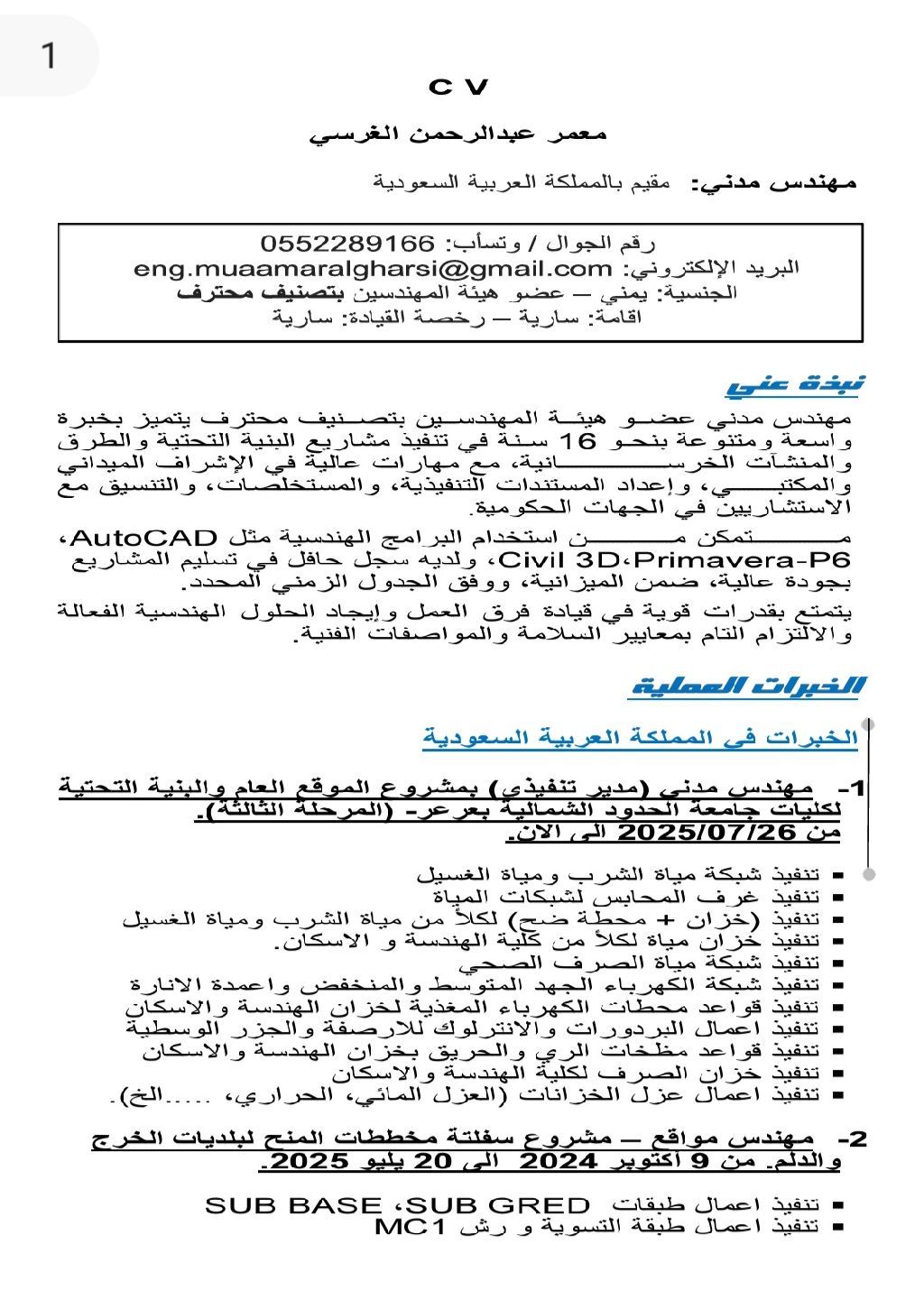مهندس مدني يمني الجنسية عضو هيئة المهندسين بدرجة محترف خبرة 16 سنة في مشاريع البنية التحتية والطرق والمنشاءات الخرسانية (على وشك التفرغ)