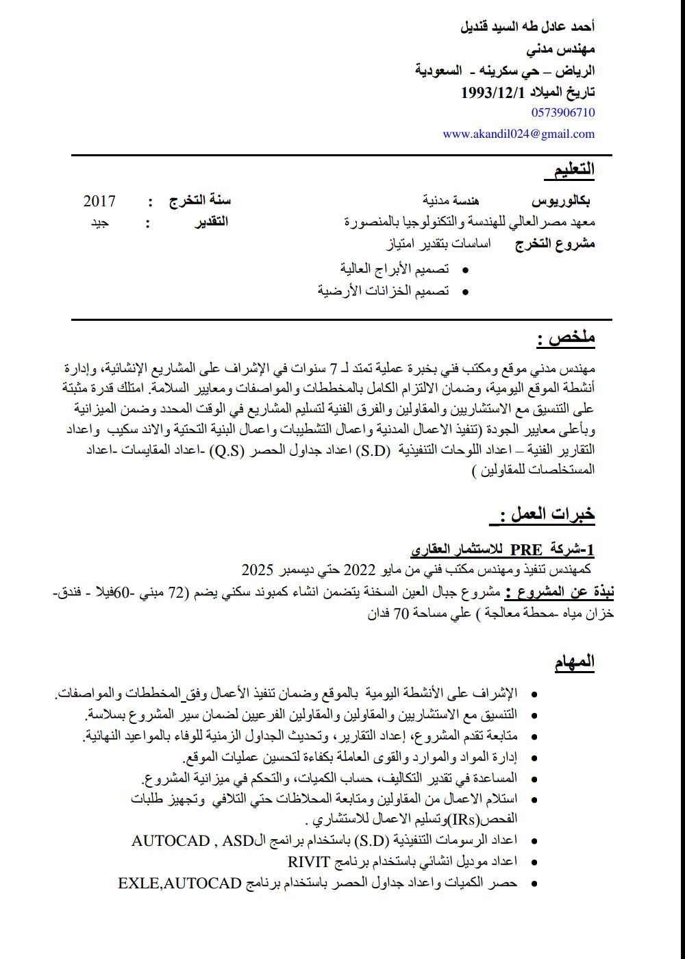 Civil Engineer (7 + years exp) expert in Site & Technical Office works. Proficient in Shop Drawings, Quantity Surveying, Invoices, and QA/ QC standards. Skilled in AutoCAD, ASD, Revit & Excel with a proven track record in project delivery and site management. Highly organized, result - oriented, and ready for immediate joining with a transferable Iqama
