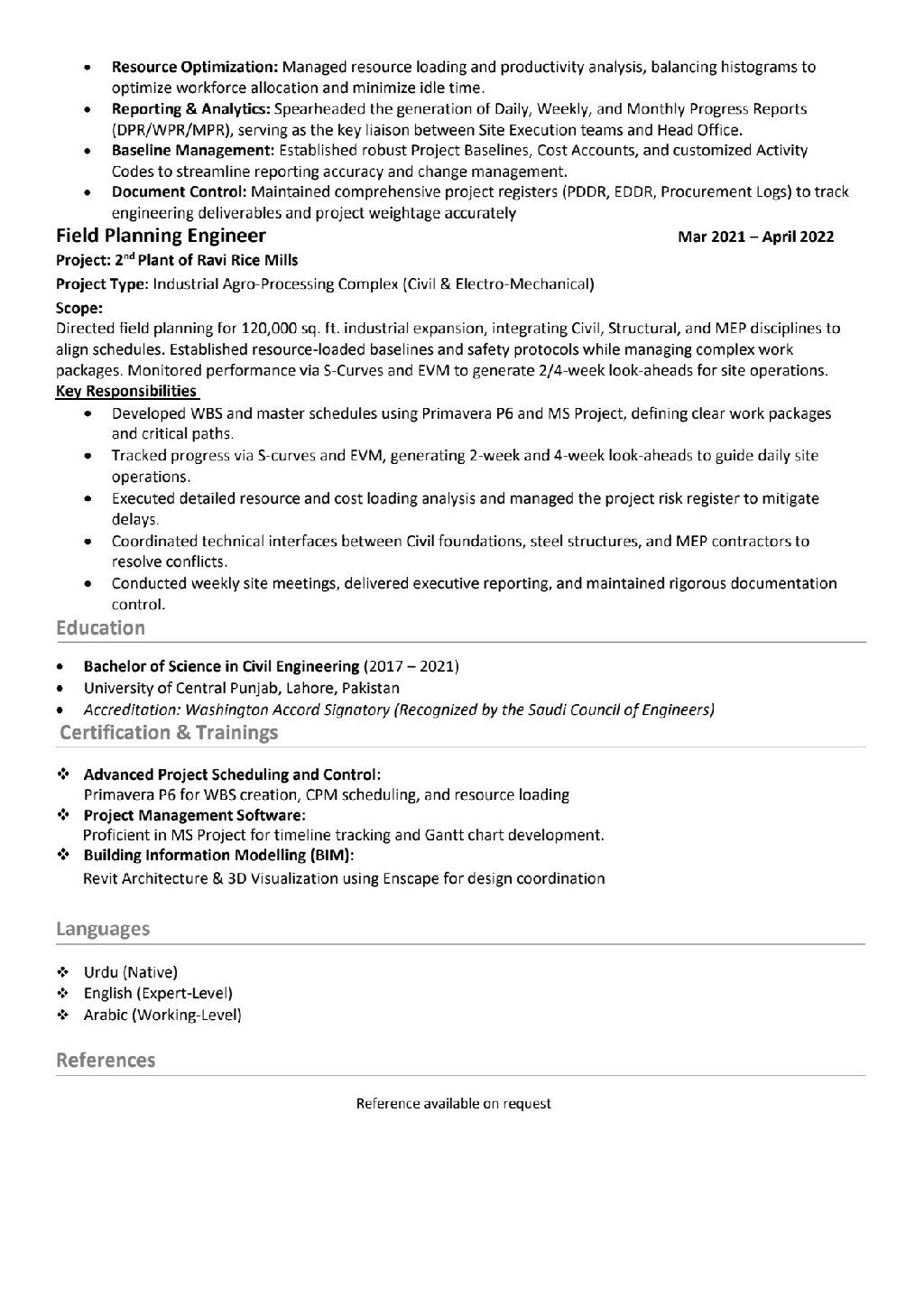 Planning Engineer with 5 years of experience in Healthcare, Infrastructure, and Building projects. Proficient in Primavera P6, MS Project, CPM scheduling, and baseline development. Experienced in progress measurement, S Curves, dashboards, and Earned Value Management (SPI, CPI) Skilled in delay analysis, resource planning, and identifying schedule variances. Strong coordination with teams