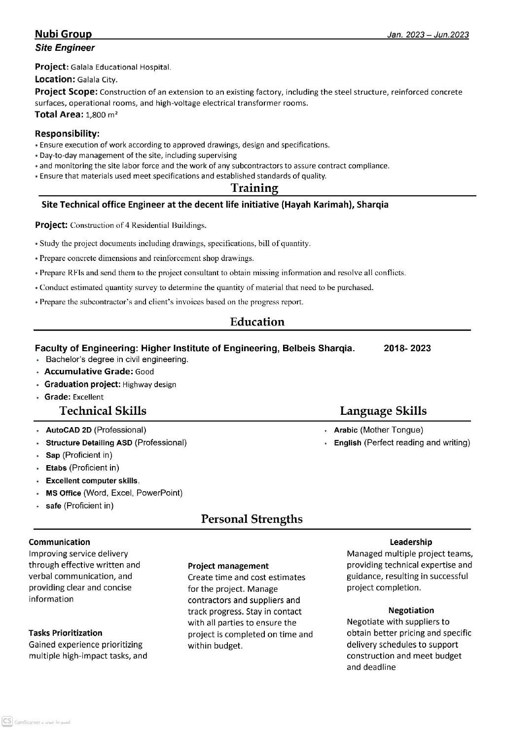 Civil Engineer with 3 years of experience in construction, finishing works, and technical office activities. Experienced in site supervision, concrete works, building and finishing works, quantity take - off and progress payments, reading architectural and structural drawings, and working with AutoCAD. Currently located in Saudi Arabia and available for immediate joining