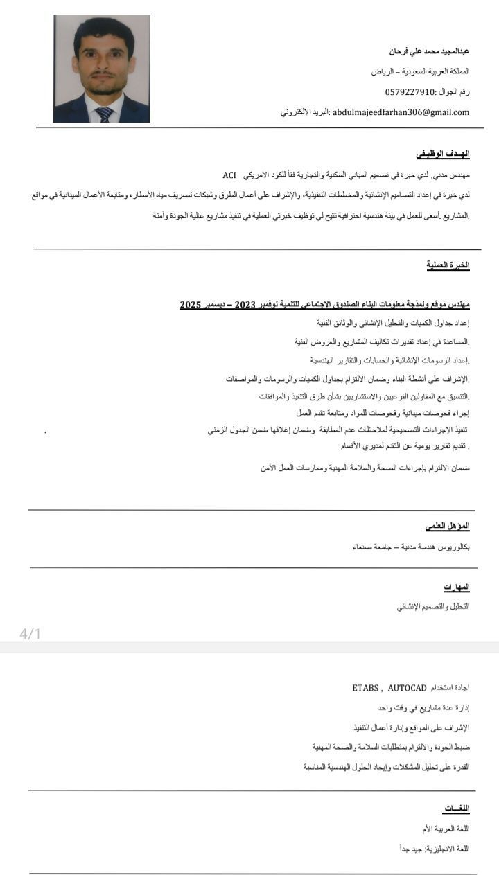 Civil Engineer from Yemen with 2.5 years of experience in project execution. Specialized in site management, quality control, and delivering projects on time. Experienced in handling projects from initial handover to final finishing works. Skilled in quickly and efficiently resolving site issues, managing work teams, and supervising all construction activities from excavation to final delivery
