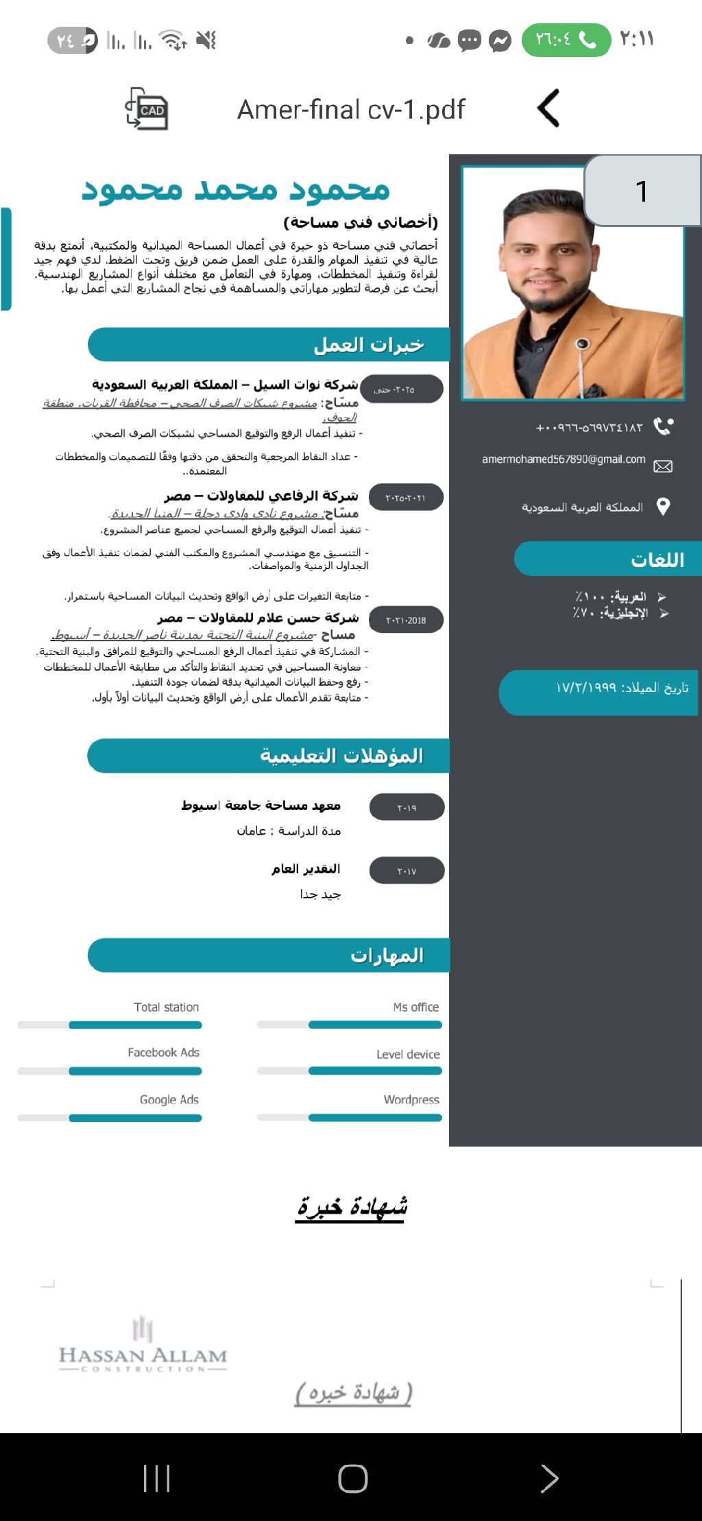 محمود محمد محمود فني مساحة مصري الجنسية خبرة 8 سنوات
