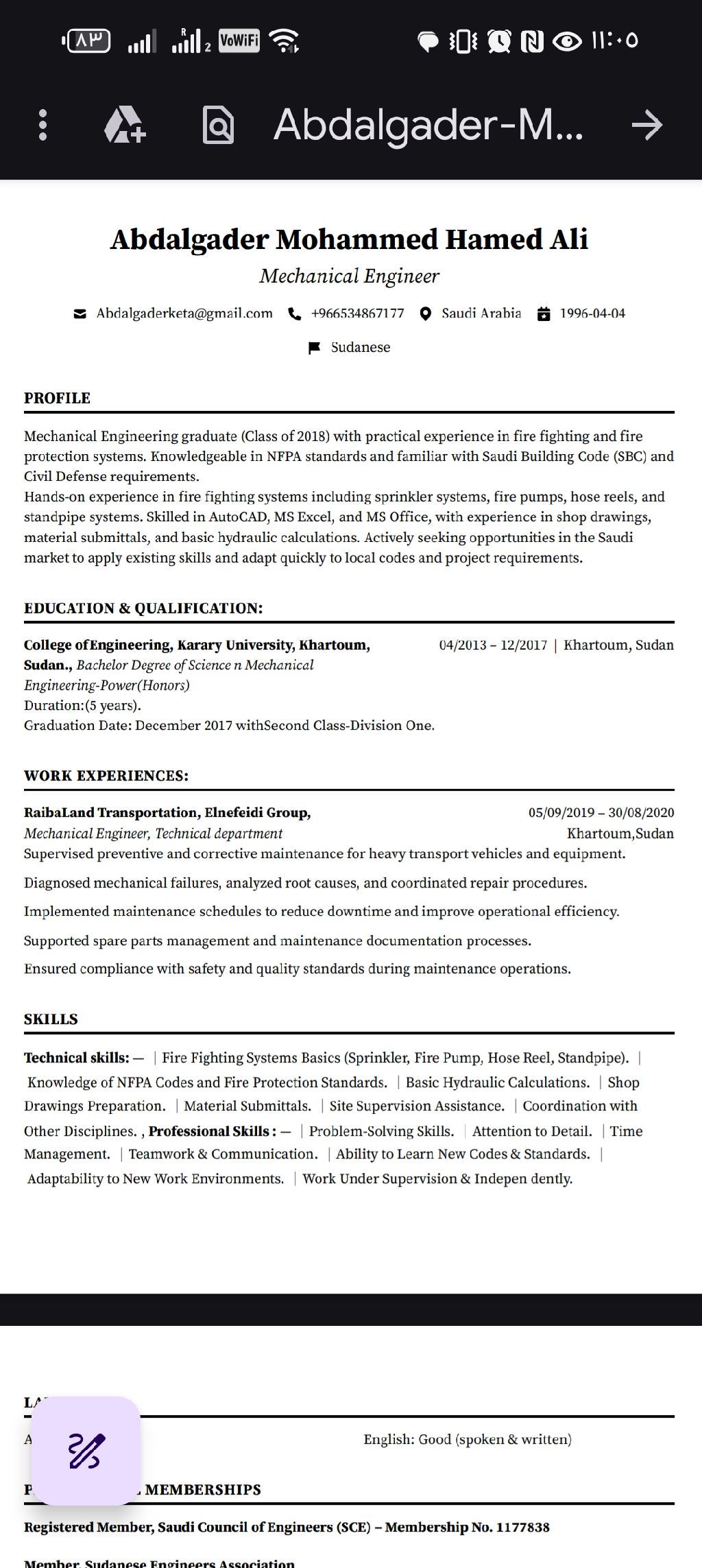 مهندس ميكانيكا مع عضوية سارية في الهيئة السعودية للمهندسين وإقامة قابلة للنقل