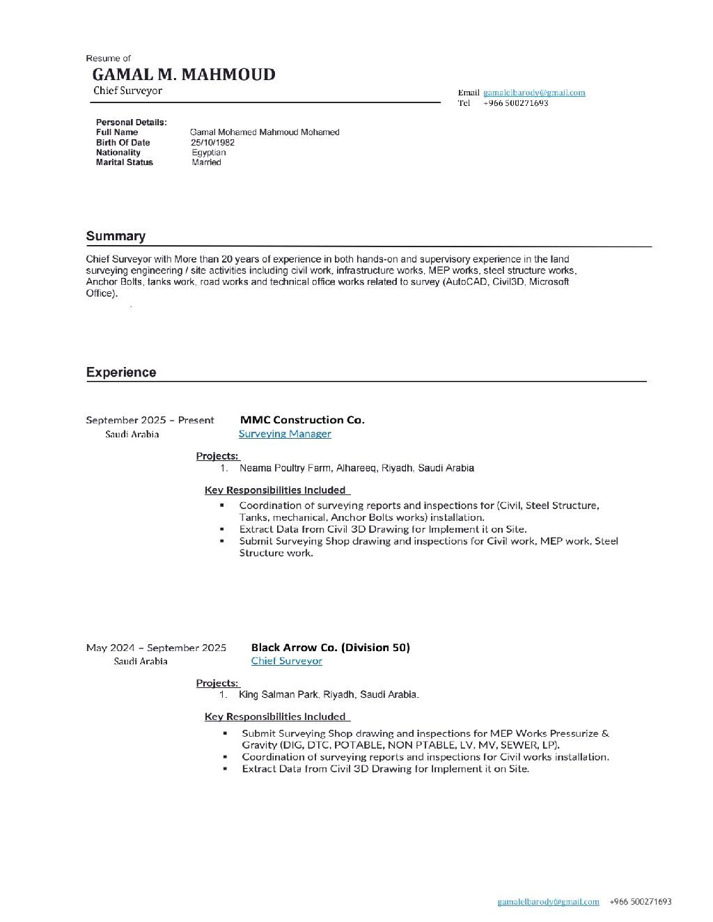 Chief Surveyor with More than 20 years of experience in both hands - on and supervisory experience in the land surveying engineering/ site activities including civil work, infrastructure works, MEP works, steel structure works, Anchor Bolts, tanks work, road works and technical office works related to survey (AutoCAD, Civil 3D, Microsoft Office