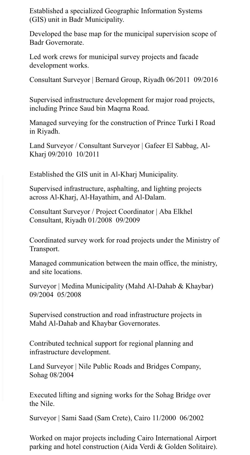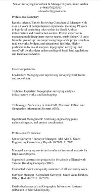 مساح استشاري / كبير مساحين استشاري. خبرة 25 عام أجيد التعامل مع البرامج الهندسيه ومعتمد لدى (أمانة المدينة المنورة / أمانة الرياض / وزارة البلدية والقروية / شركة المياه الوطنية NWC) مسجل بهيئة المهندس السعودية