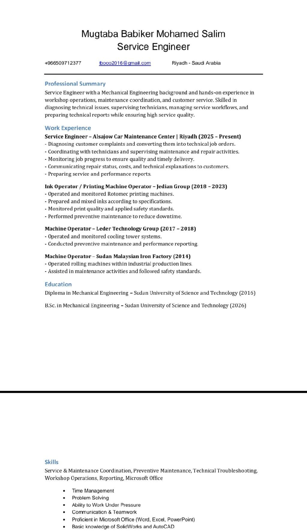مهندس استقبال ورش سيارات - خبرة في شركات التأمين ومؤهل لإدارة الصيانة خبرة قوية في استقبال العملاء، المعاينات الميدانية، التشخيص المبدئي، اعداد التقارير الفنية والتسعير وفق معايير شركات التأمين. اجادة العمل على أنظمة وتطبيقات مسمار - 360 - نجم - ميد غلف - وغيرها من التطبيقات الأخرى. مؤهل لإدارة قسم الصيانة وتنظيم سير العمل داخل الورشة، مع القدرة على رفع كفاءة التشغيل وتسريع اجراءات الموافقات