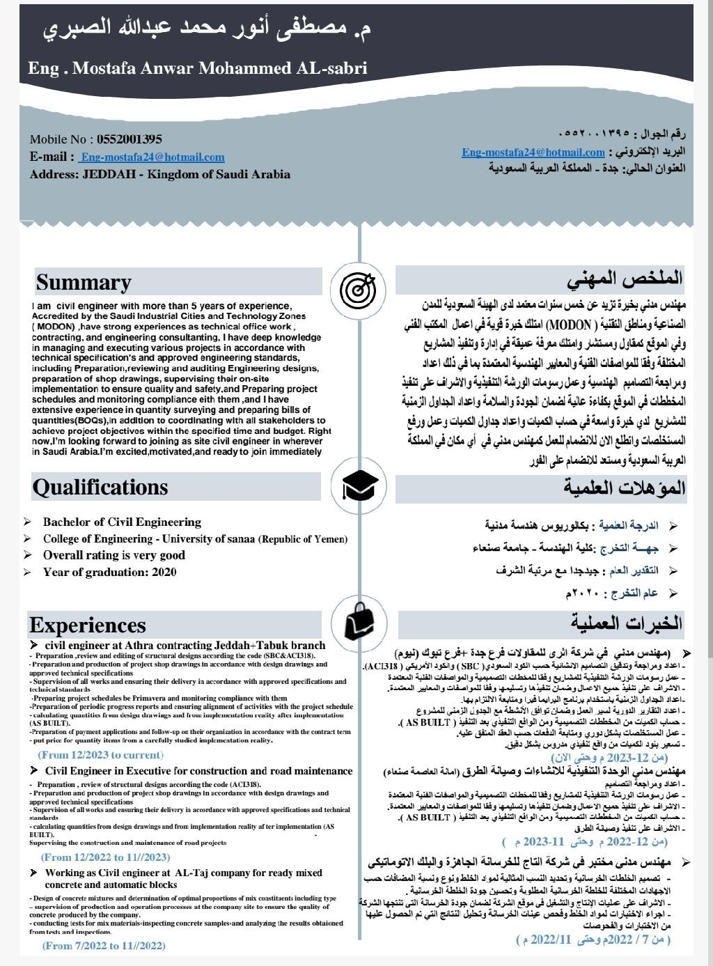 مهندس مدني بخبرة تزيد عن خمس سنوات، معتمد لدى الهيئة السعودية للمدن الصناعية ومناطق التقنية (MODON) امتلك خبرة قوية في أعمال المكتب الفني تشمل اعداد التصاميم الانشائية، واعداد رسومات الورشة التنفيذية (Shop Drawings) وحساب الكميات، واعداد الجداول الزمنية للمشاريع. كما امتلك خبرة ميدانية في الاشراف التنفيذي على مراحل العظم والتشطيبات، اضافة الى اعداد ورفع المستخلصات المالية