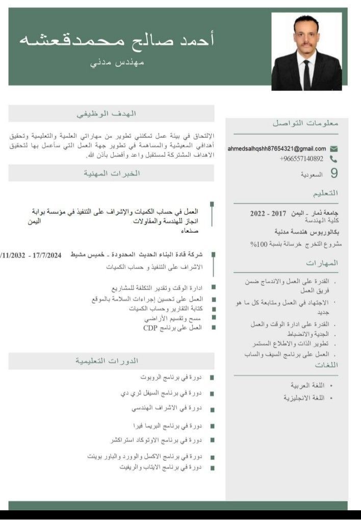 A civil engineer specializing in quantity surveying using Excel, AutoCAD, and Swift, with experience in a drawing shop, willing to learn and work in any region of the Kingdom, and available for sponsorship transfer