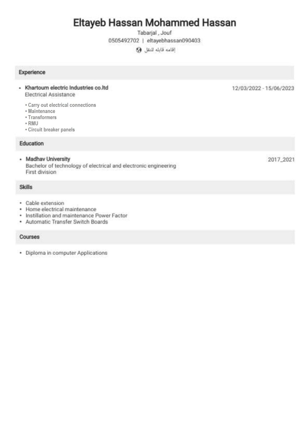 مهندس كهربائي خبرة في مجال البور خبرة في مجال العقد الموحد
