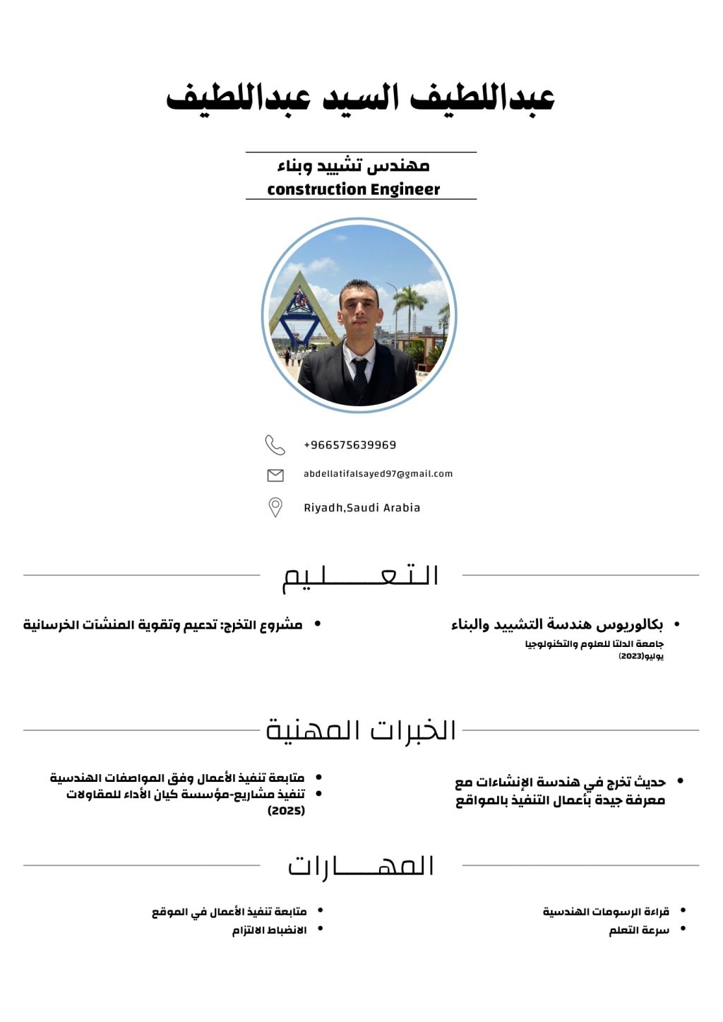 ابحث عن فرصة عمل في مجال هندسة التشييد. أنا خريج هندسة انشاءات وأسعى للانضمام الى فريق عمل الاكتساب الخبرة العملية وتطوير مهارتي في مجال التنفيذ والاشراف وادارة المشاريع. امتلك معرفة جيدة بأساسيات الهندسة الانشائية وأسعى الى تقديم أفضل ما لدي لخدمة الشركة والمساهمة في نجاح المشاريع