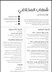 مهندس مدني بخبرة 3 سنوات، معتمد من الهيئة السعودية للمهندسين، شغوف بالتخصص ومحب للعمل والتطوير المستمر. لدي خبرة في الاشراف والتنفيذ، ومشروع تخرجي كان تصميم وتحليل برج باستخدام برامج هندسية متقدمة. أتميز بالقدرة على تحمل ضغط العمل، والعمل بروح الفريق، وسرعة التعلم، وحل المشكلات بكفاءة، وأسعى دائما لتقديم أفضل النتائج
